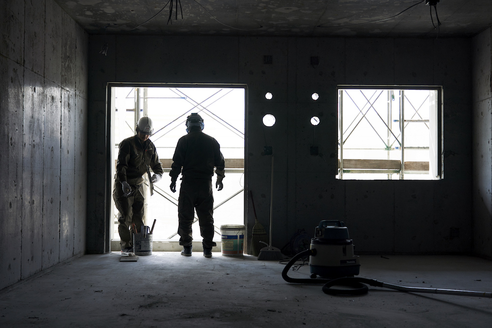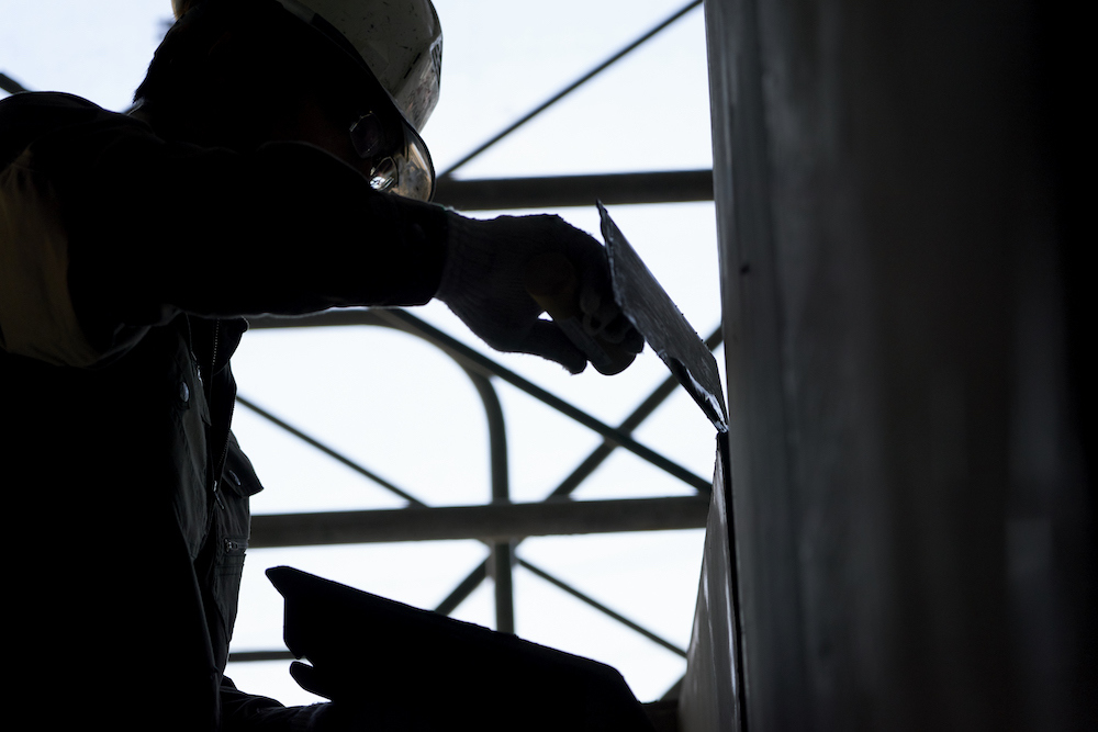 木山組は熊本県天草市から北九州に出てきた同郷メンバーではじまった会社です。左官業には戸建て住宅や店舗などの内外壁を主にする「町場(まちば)」と、マンション・ビル・商業施設などを専門とする「野丁場(のちょうば)」という2つの仕事があります。私たちは「野丁場」を主体事業とし、ポンプ車を使った躯体のコンクリート打設工事※、下地づくりのような目立たないけれど建築工事の質を左右する大切な業務を担っています。形ないものを自在に仕上げる左官の可能性を探求しつつも、大規模な建設工事においては経験豊富な番頭や班長による現場との安定した連携をつくりながら、特殊左官から一般左官まであらゆる左官工事を請負っています。